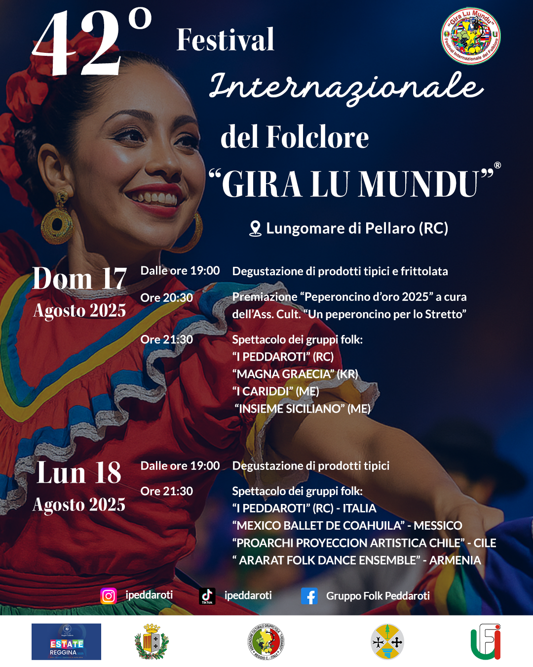 Divertirci e farvi divertire…. Con questo spirito nasce nel 1980 il Festival Internazionale del Folklore. Ed è con lo stesso spirito che ogni anno viene riproposto, nel mese di agosto, a Pellaro, in provincia di Reggio Calabria. Il nostro Festival ha loFe scopo di promuovere l’interazione tra le culture nel campo dell’arte popolare. L’idea principale è quello di riunire i gruppi provenienti da tutto il mondo nella nostra Pellaro,in provincia di Reggio Calabria, al fine di favorire l’arricchimento di culture e di promuovere la cooperazione culturale internazionale.